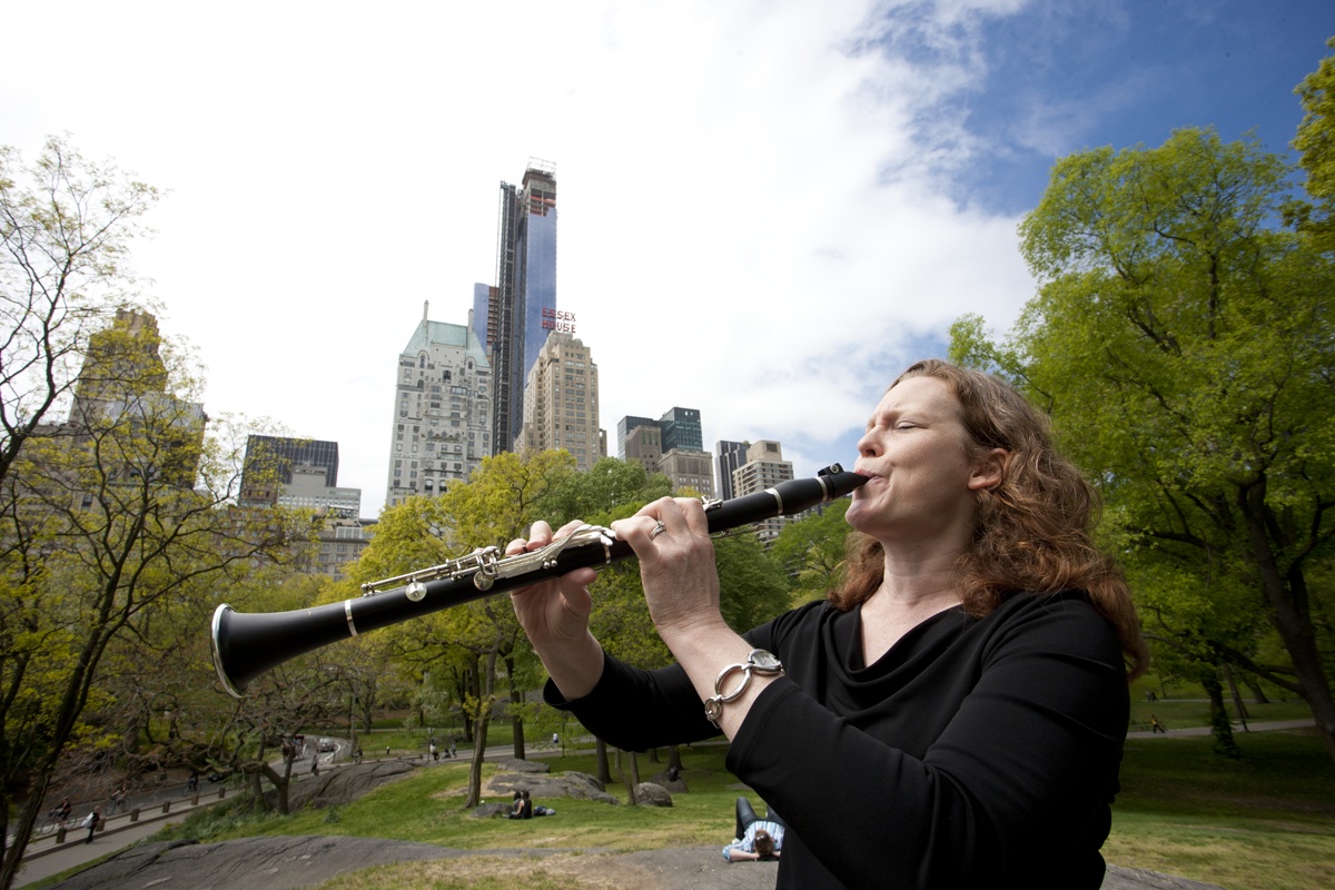 The next morning we met Maureen Hurd Hause (’94 music) in Midtown Manhattan. Maureen is actually a New Jersey alum who teaches clarinet at Rutgers University’s Mason Gross School of the Arts, but she often plays as a professional musician at Carnegie Hall, so our idea was to meet her there. The fact that the lower fourth of Carnegie Hall was covered in scaffolding didn’t deter Jim from photographing Maureen on the street corner in front of the building. We drew quite a crowd! Maureen was belting out Gershwin tunes, Jim was lying on the ground, and more than a few people photographed the goings-on with their iPhones.